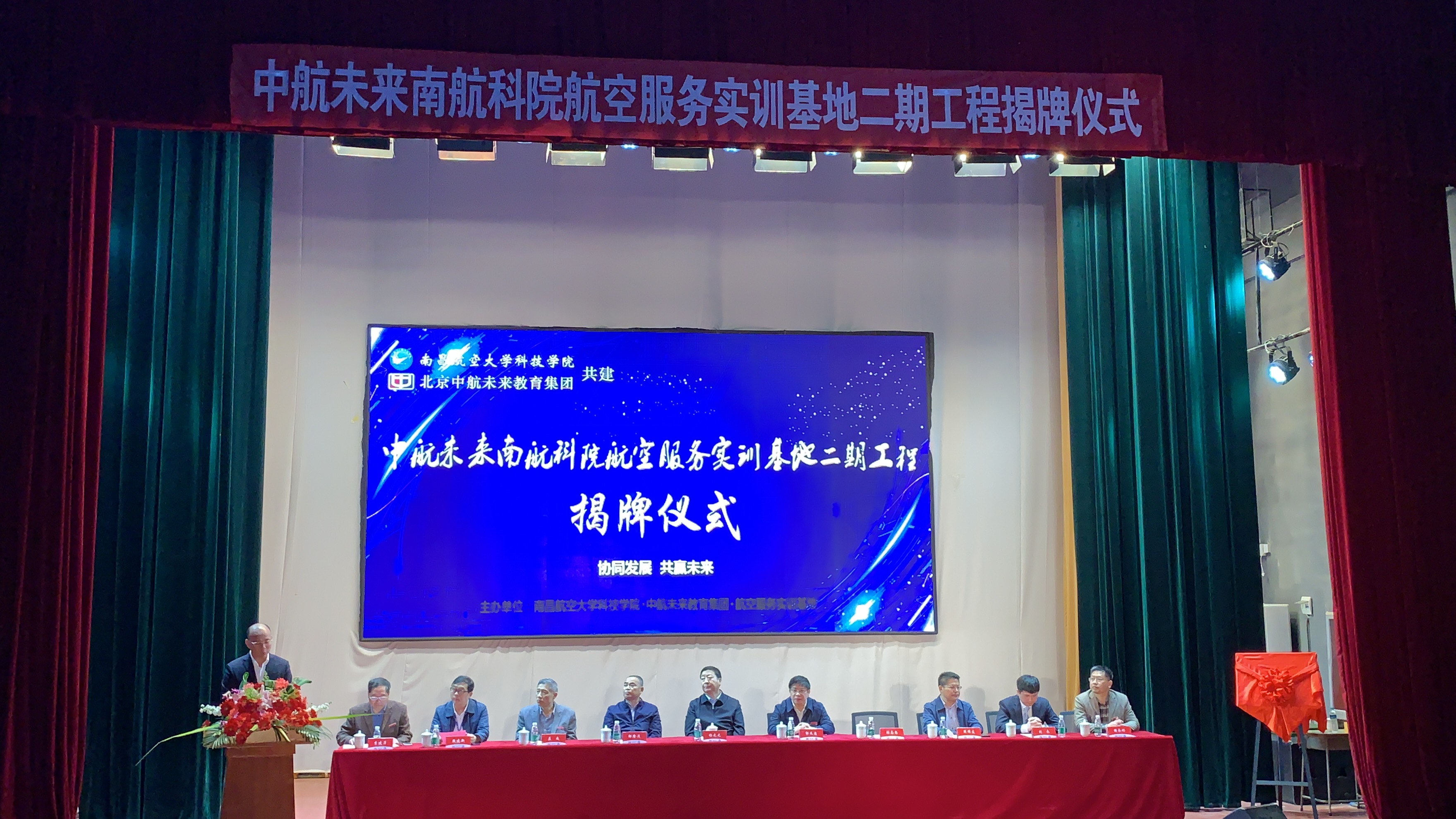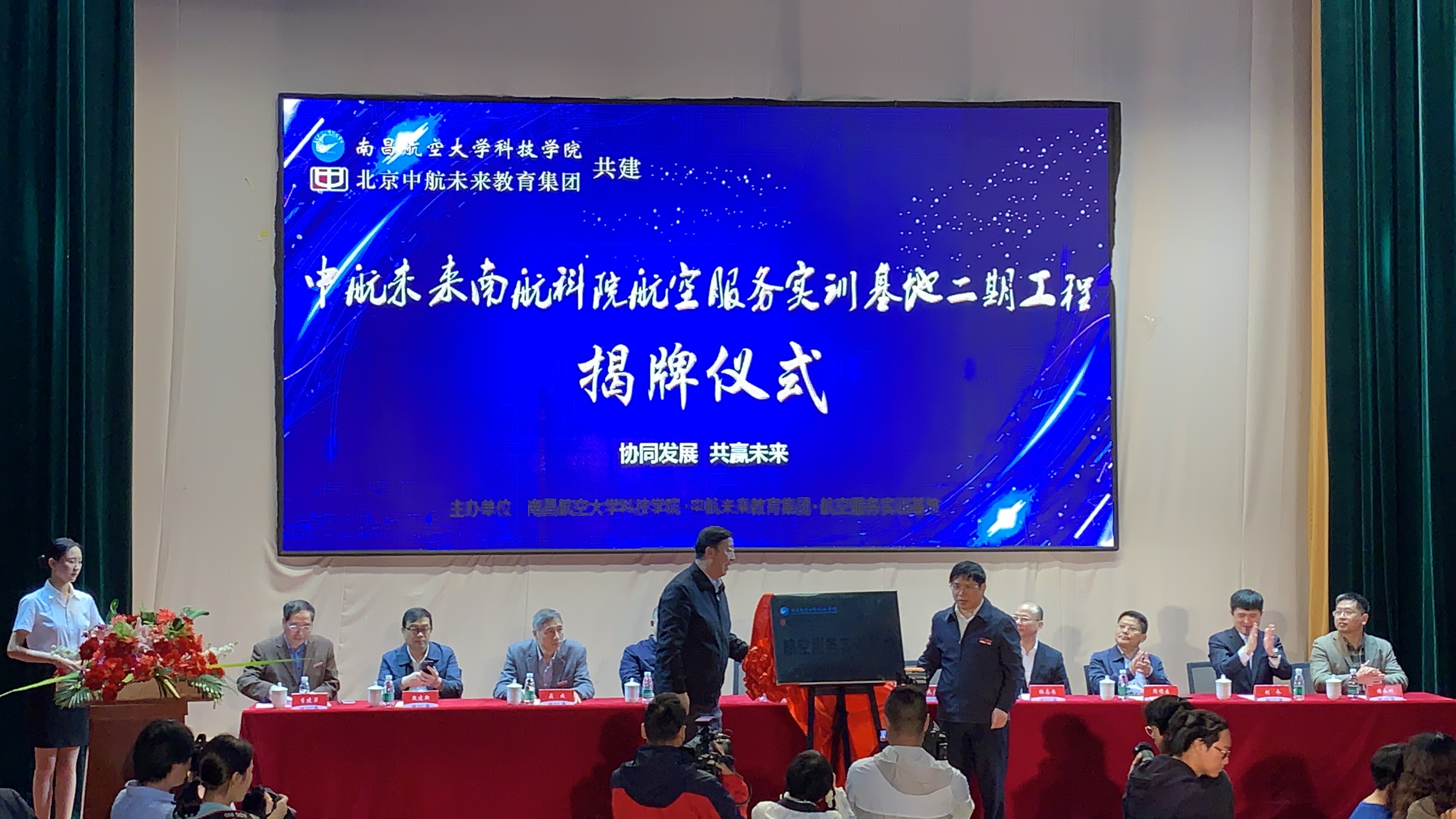 接下来,杨元元、郭杰忠为“中航未来南昌航空服务实训基地二期工程”共同揭牌并合影留念,揭牌仪式结束。